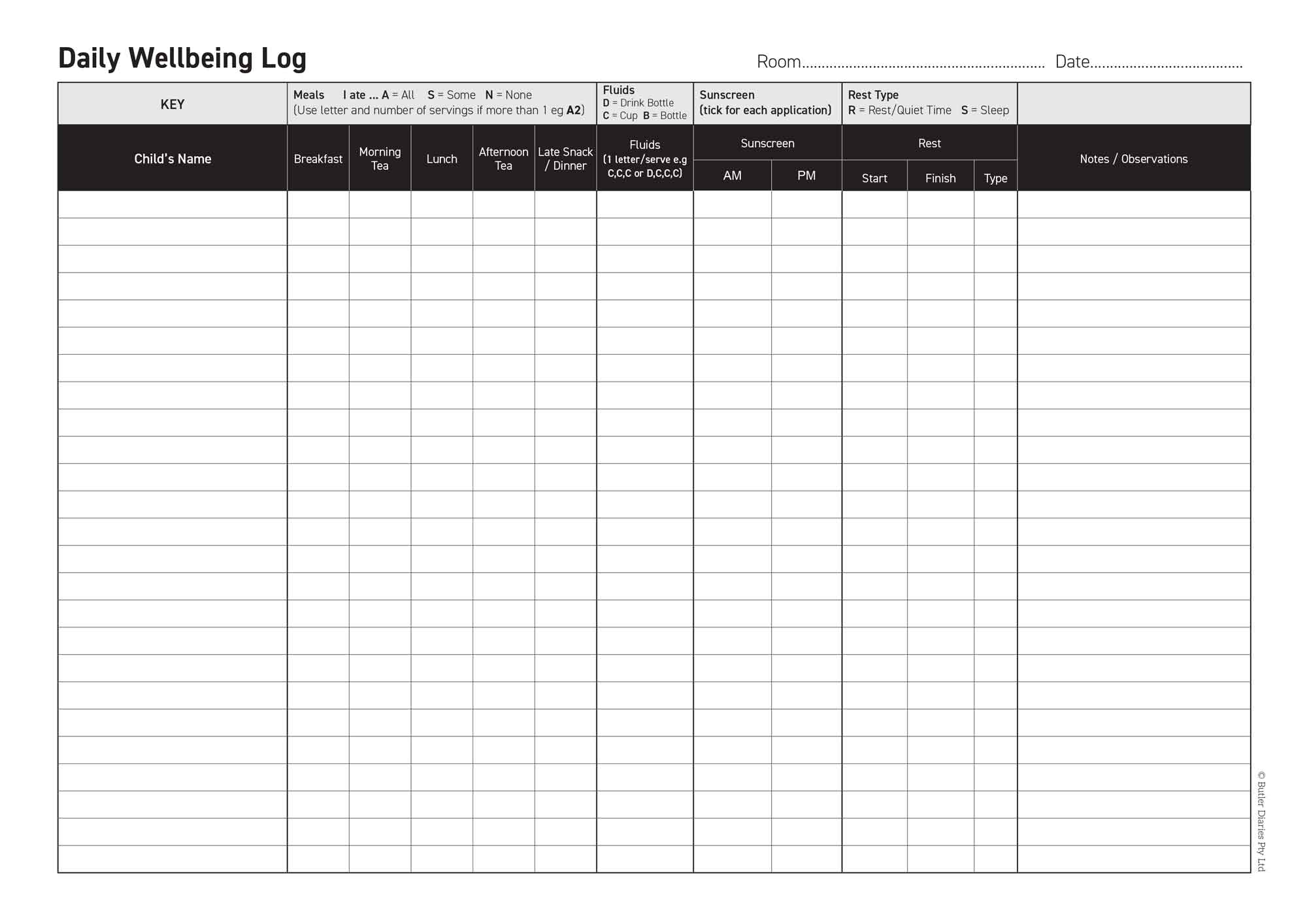 The A4 Daily Wellbeing Log Book has been designed to support your team in monitoring each child’s routines, comfort, and overall wellbeing throughout the day. It provides a clear, consistent way to record meals, rest, fluids, sunscreen, toileting, and any other care notes – ensuring families receive accurate and meaningful information at pick-up and that your service maintains high-quality standards of care.