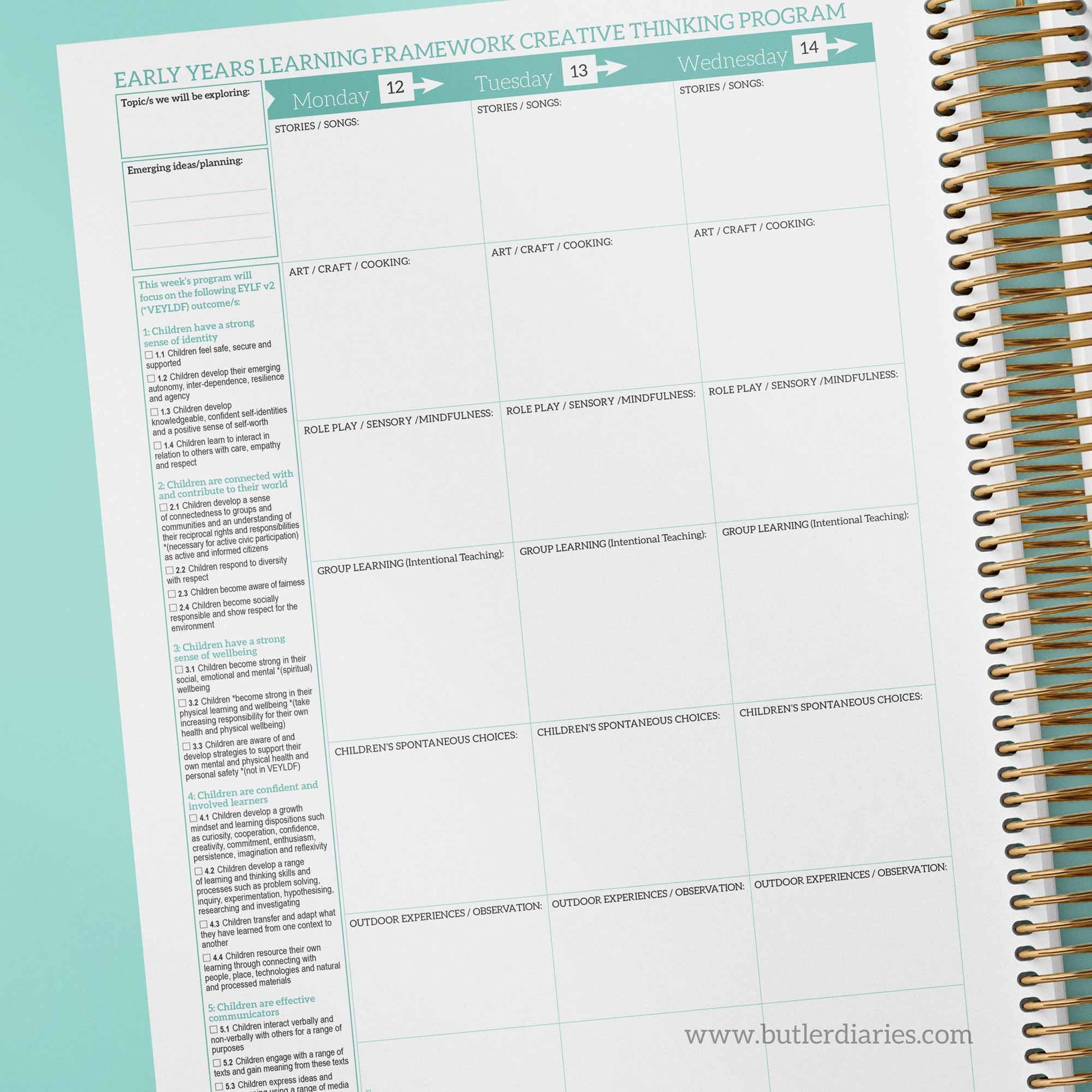 • Planning boxes prompt physical, social, emotional, cognitive, and language experiences, which are also linked to milestones and EYLF outcomes.